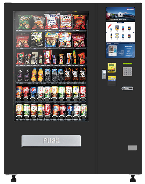 A 21.5″ multimedia touchscreen—upgradable to 32″—displays product selections and advertisements.